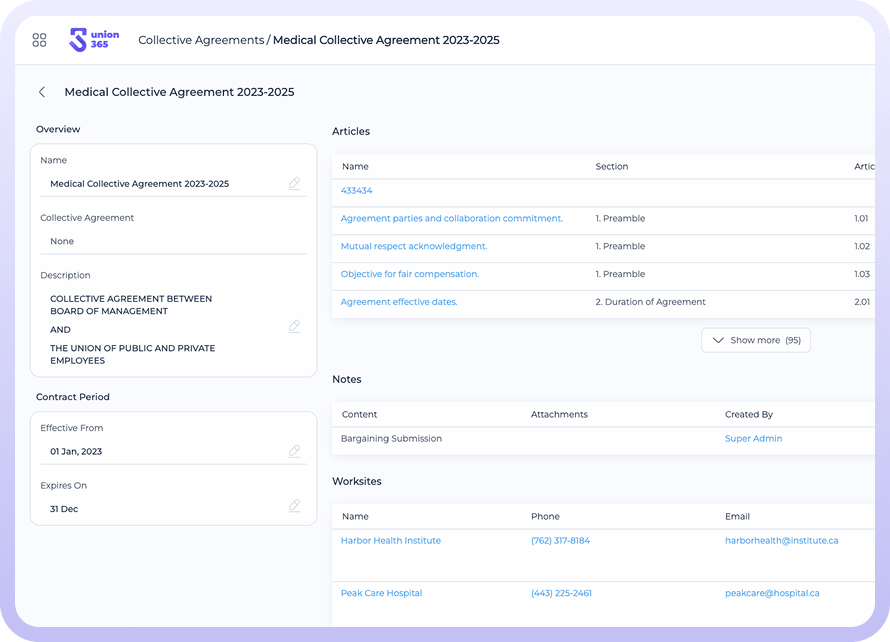 Every union relies on its collective agreements to protect members’ rights — but flipping through PDFs or chasing down paper copies wastes time and increases risk. With Union365’s built-in Collective Agreement Database, you can say goodbye to that hassle.
