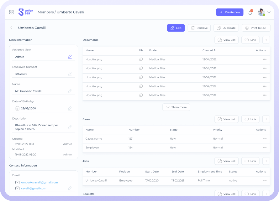 The system lets you instantly generate any document you need—letters, forms, summaries—already filled with member info, linked cases, and relevant collective agreement clauses. Everything’s connected. Just select the case—and your PDF is ready.