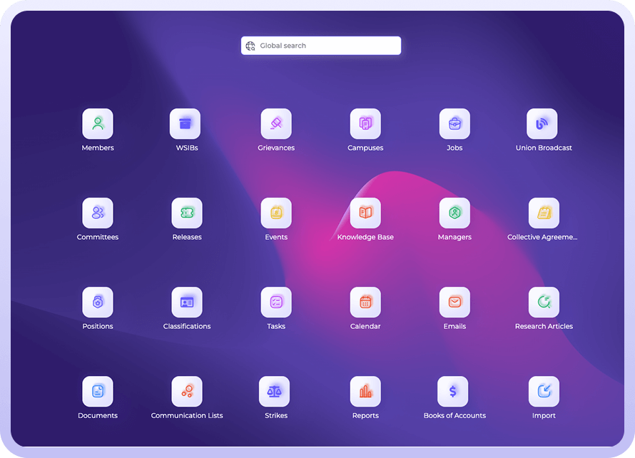 Search across members, documents, messages, grievances, collective agreements, events, and more — all from one place.