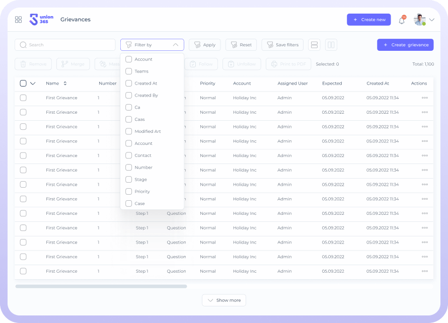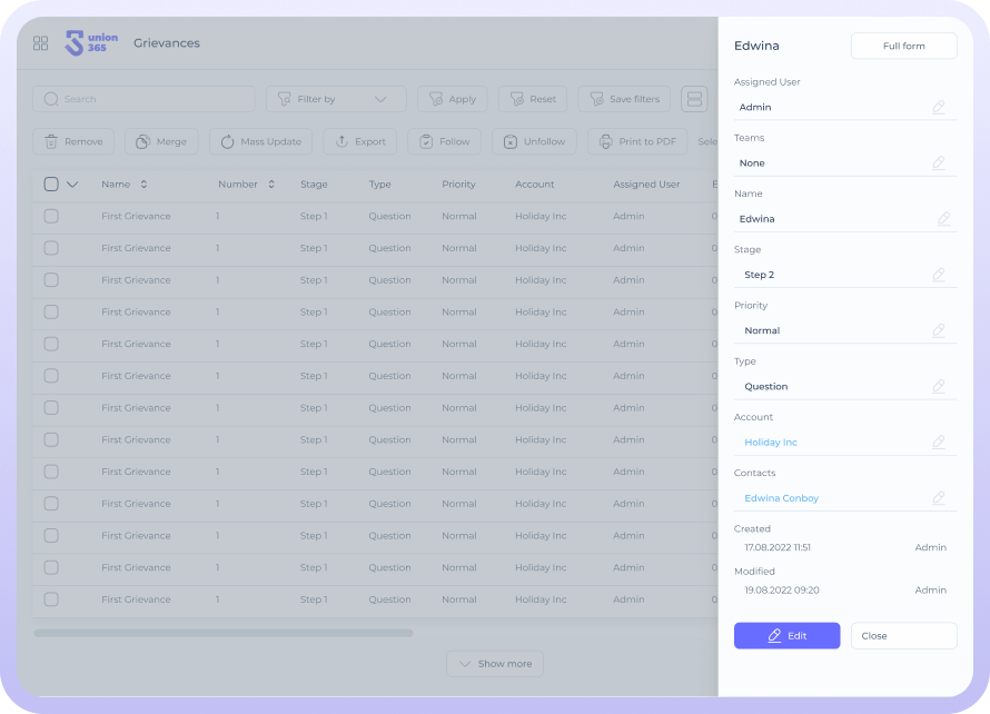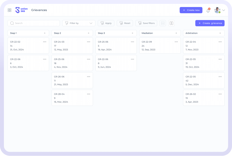 With Union365, the entire grievance process is digital — every case stored, tracked, and managed in one secure system. You get full visibility into each case, connected directly with member profiles and collective agreements.z