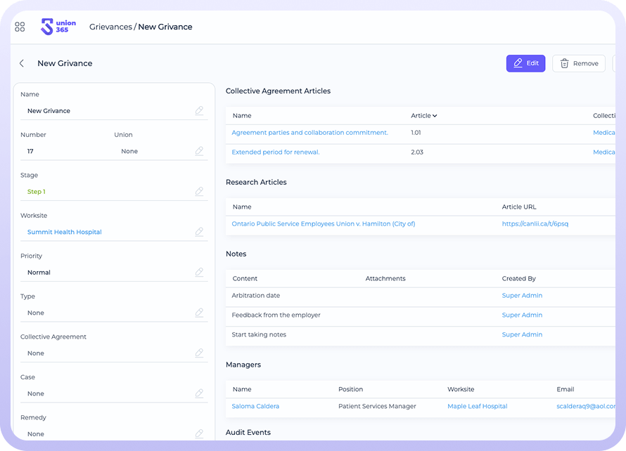 Union365 centralizes all your grievance cases, member details, and collective agreements in a single, secure dashboard. Everyone sees the same information, in real-time — so nothing gets lost, missed, or duplicated.