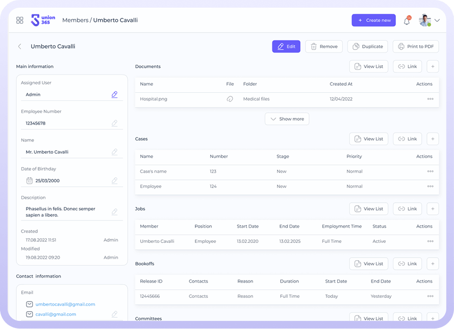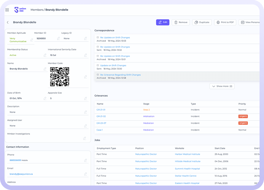 Union365 gives you a centralized, searchable system for storing all member data — names, worksites, dues, contact details, history, and more — so you always have the full picture, instantly.